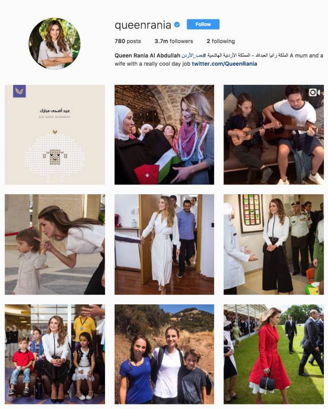 皇后拉尼亚(Rania)的新闻也十分抢眼,镜头下的皇后,永远美丽、智慧、且亲民。上午皇后在社群软件Instagram上发出的贴文,通常就是傍晚我进办公室看到的新闻标题和配图,内容经常是皇后为妇女、儿童、教育等议题发声,或是去某个基金会关心小孩等 。
